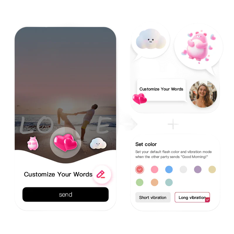 Connected to the app via Bluetooth, the bracelets let you turn any message into a unique signal — with customizable flash colors and vibration patterns to say "I miss you," "Kiss," or any special code you create.